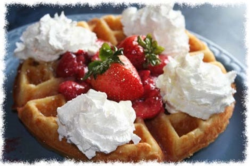 A golden Belgium waffle topped with choice of strawberries, blueberries, or cinnamon apples.