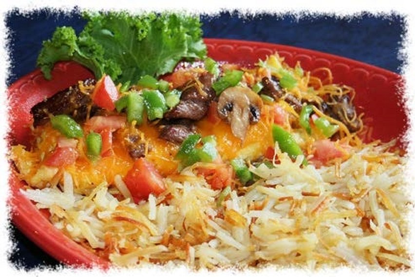 Fluffy omelet stuffed with steak, mushrooms, green peppers, onions & topped with tomatoes and cheddar cheese
